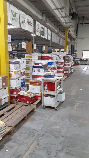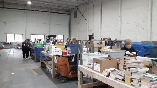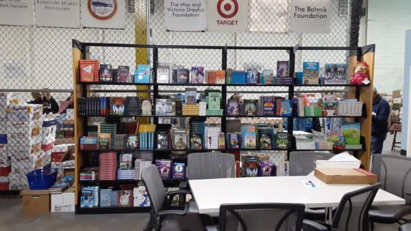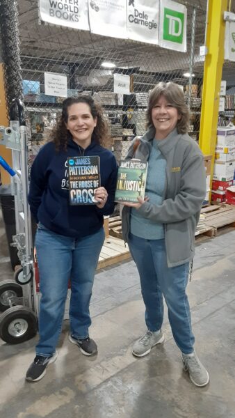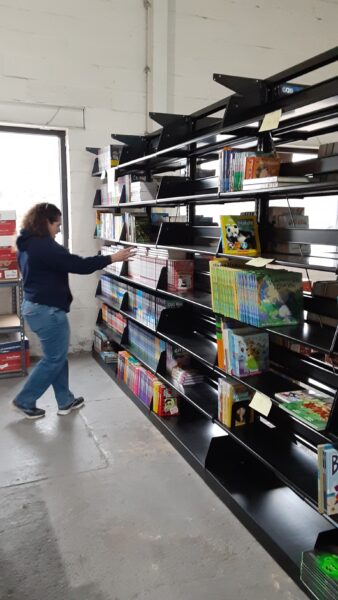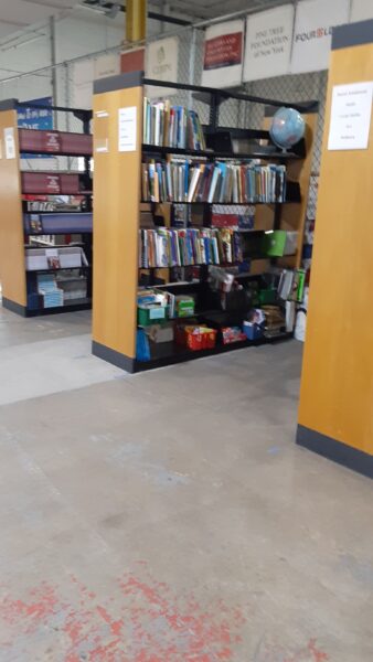 Sherri McGrath with Ann Marie GailiusShelving donated by Kiwanis of MassapequaTeachers resource areaBooks ready for the next scheduled distributionVolunteers of all agesBooks separated by age, interest