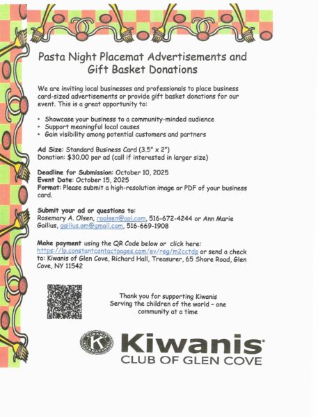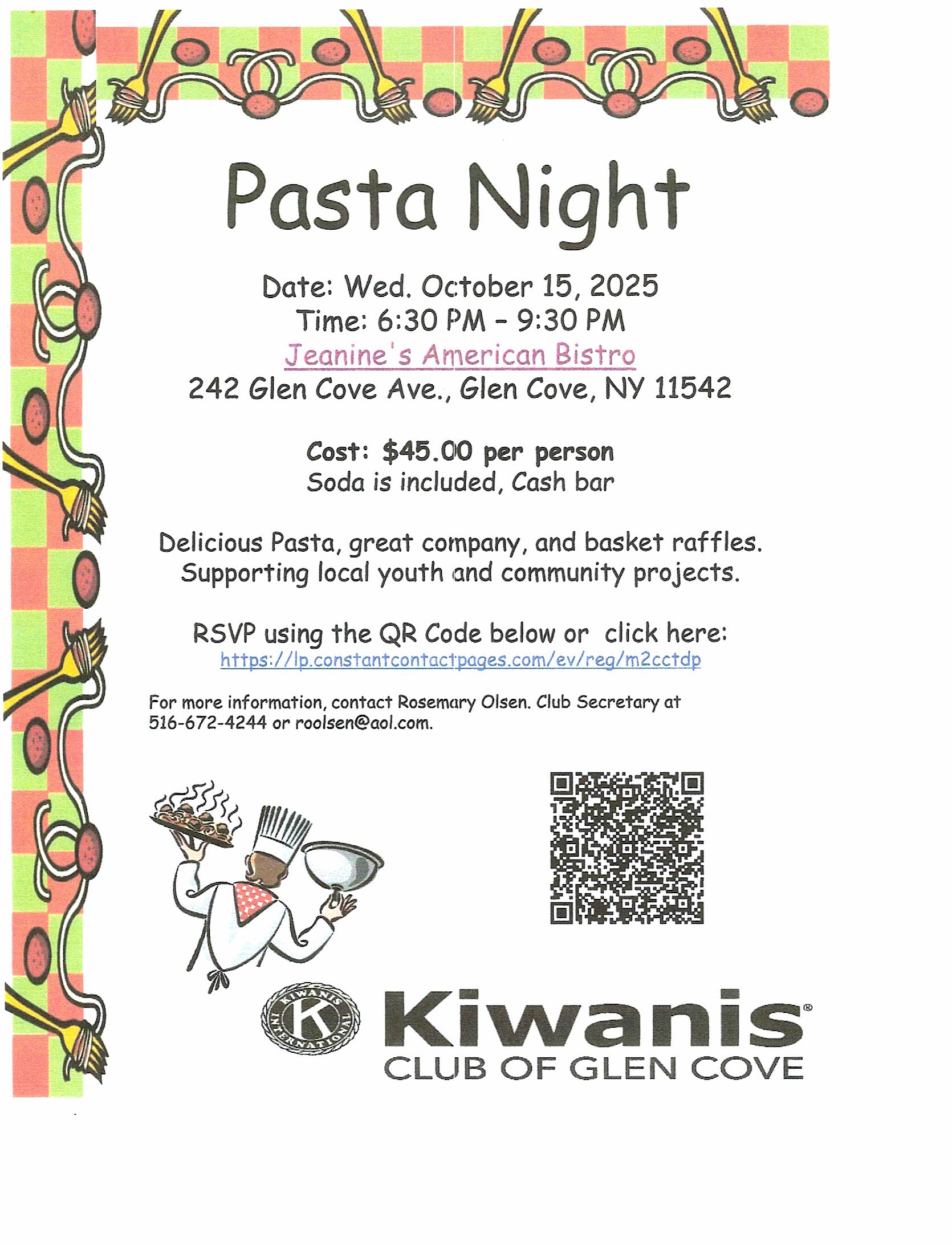 We will be hosting our Pasta Nite Wednesday Oct 15 2025 @ 6:30 pm at Jeanine’s American Bistro 242 Glen Cove Ave Glen Cove, NY 11542. Many ways to show your support,https://lp.constantcontactpages.com/ev/reg/m2cctdp