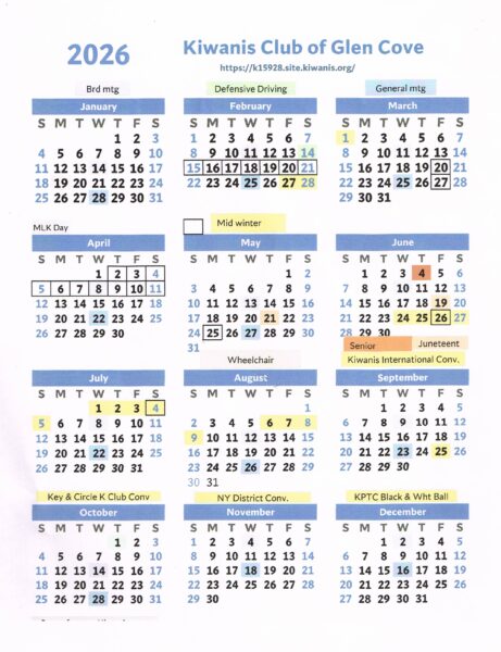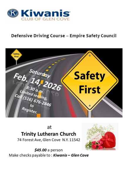 Our Annual Defensive Driving Course is BACK! Thanks to our member Phyllis O. Burnett, she is our Safety Advisor. She hosts her Certified defensive driving course 4 times a year, winter, spring, summer and fall. The first class of 2026 is scheduled for Valentine’s Day Saturday February 14 2026 8:30 am Trinity Lutheran Church 74 Forest Ave Glen Cove, NY 11542. Call for reservations: 516-676-2846. $45.00 per person (no discounts), all proceeds are donated directly to Kiwanis Club of Glen Cove to assist in their yearly activities.